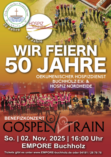 50 Jahre hospizliches Engagement in Buchholz – anlässlich unserer Jubiläen, 30 Jahre Oekumenischer Hospizdienst Buchholz., sowie 20 Jahre Hospiz Nordheide, möchten wir den gemeinsamen Weg der ambulanten und stationären hospizlichen Begleitung schwerstkranker und sterbender Menschen sowie ihrer Zugehörigen mit einem Benefizkonzert ehren.